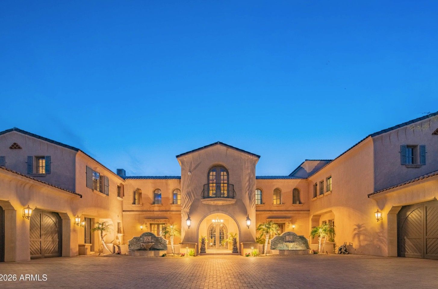 - Outdoor fireplace and fountain creating a serene desert oasis